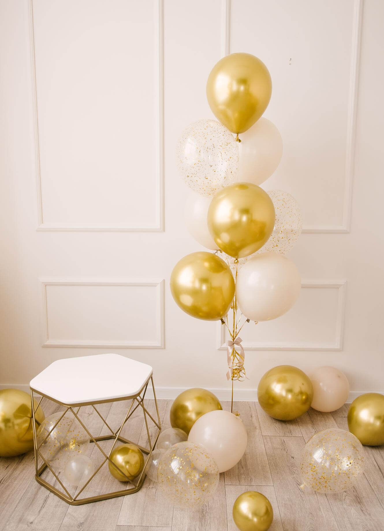 Gold and white balloons with confetti on the floor beside a modern stool in a decorated room.